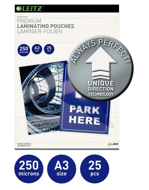 * Ultra Premium hoezen voor warmlamineren. * Hoogglans. * Leitz iLAM lamineerhoezen voldoen aan de hoogste vereisten voor bescherming van belangrijke documenten en presentaties. * Geen zorgen meer! De Unique Direction Technoloy verzekert een perfect resultaat. * Lamineren is zeer eenvoudig met Unique Direction Technology - plaats het document in de hoes en voer het in de lamineermachine in - pijltjes op de hoes tonen de juiste invoerrichting en verdwijnen na het lamineren.