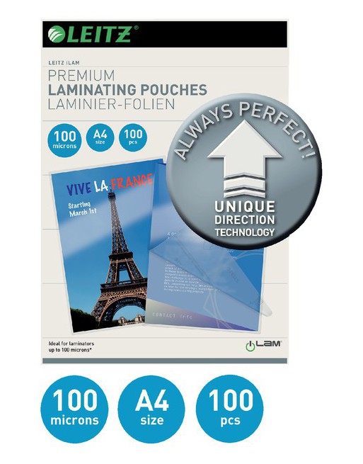 * Ultra Premium hoezen voor warmlamineren. * Hoogglans. * Leitz iLAM lamineerhoezen voldoen aan de hoogste vereisten voor bescherming van belangrijke documenten en presentaties. * Geen zorgen meer! De Unique Direction Technoloy verzekert een perfect resultaat. * Lamineren is zeer eenvoudig met Unique Direction Technology - plaats het document in de hoes en voer het in de lamineermachine in - pijltjes op de hoes tonen de juiste invoerrichting en verdwijnen na het lamineren. 1 pak x 100 stuk