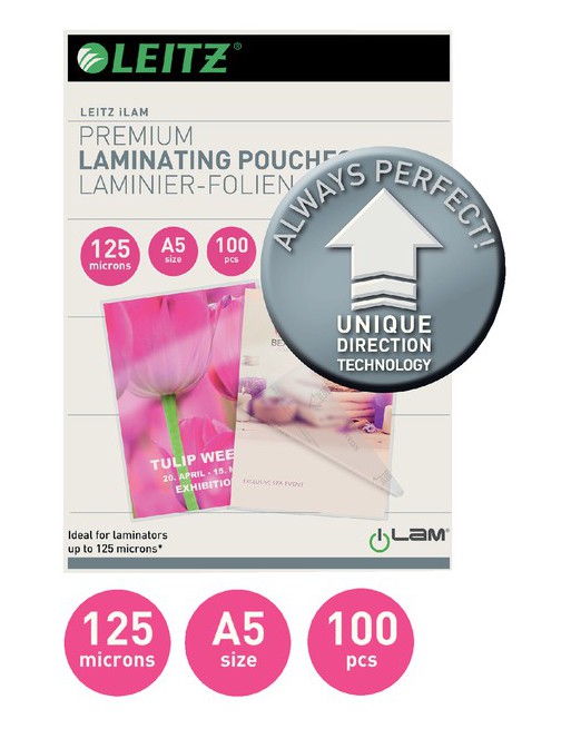 * Ultra Premium hoezen voor warmlamineren. * Hoogglans. * Leitz iLAM lamineerhoezen voldoen aan de hoogste vereisten voor bescherming van belangrijke documenten en presentaties. * Geen zorgen meer! De Unique Direction Technoloy verzekert een perfect resultaat. * Lamineren is zeer eenvoudig met Unique Direction Technology - plaats het document in de hoes en voer het in de lamineermachine in - pijltjes op de hoes tonen de juiste invoerrichting en verdwijnen na het lamineren. 1 pak x 100 stuk