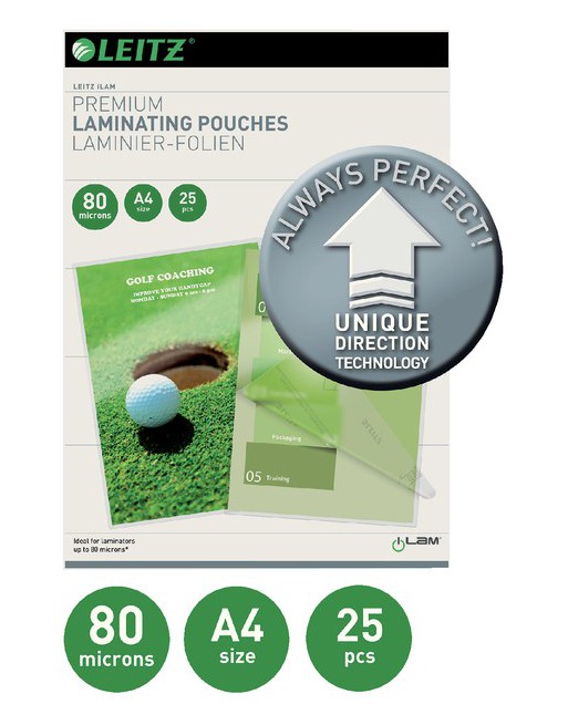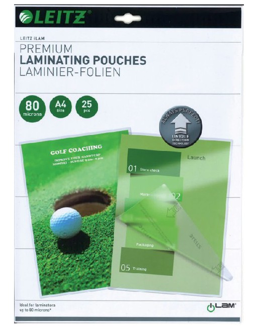 * Ultra Premium hoezen voor warmlamineren. * Hoogglans. * Leitz iLAM lamineerhoezen voldoen aan de hoogste vereisten voor bescherming van belangrijke documenten en presentaties. * Geen zorgen meer! De Unique Direction Technoloy verzekert een perfect resultaat. * Lamineren is zeer eenvoudig met Unique Direction Technology - plaats het document in de hoes en voer het in de lamineermachine in - pijltjes op de hoes tonen de juiste invoerrichting en verdwijnen na het lamineren. 1 pak x 25 stuk