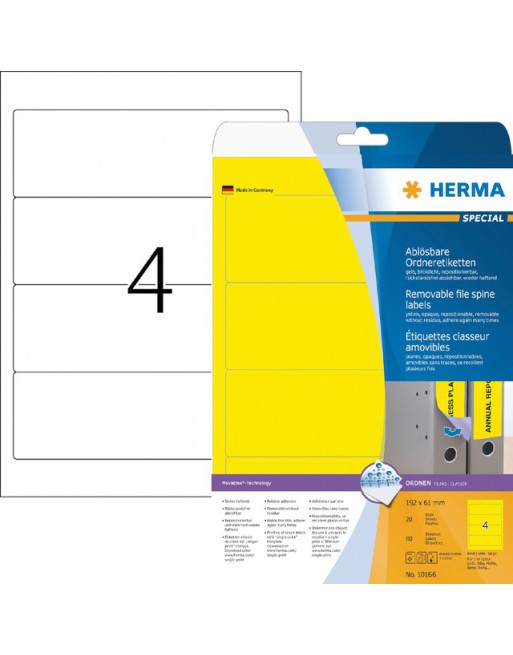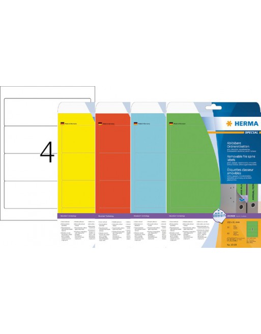 * Verwijderbare ordneretiketten op A4-vellen. * Met Movables®-Technology: goed hechtend, ook bij veelvuldig gebruik van de ordner, zonder achterblijvende resten weer te verwijderen. * Absoluut ondoorzichtig materiaal met een hoge witheidsgraad, oude ordneropschriften schijnen niet door. * Blanco, ideaal voor bedrijfslogo, opschriften en ordneraantekeningen. * Milieuvriendelijk: FSC Mix Credit-gecertificeerd, chloorvrij gebleekt, oplosmiddelvrije contactlijm. * Etiketten zijn 100% recyclebaar met het oud papier, verpakking van gerecycled karton. * Zeer goede afdrukresultaten op alle laser- en inkjetprinters, kopieerapparaten, kleurenlaserprinters en kleurenkopieerapparaten. * Storingvrije verwerking dankzij veiligheidsrand rondom en optimale vlakligging. * Gratis softwareoplossingen: www.herma.com/software. 1 doos x 20 vel