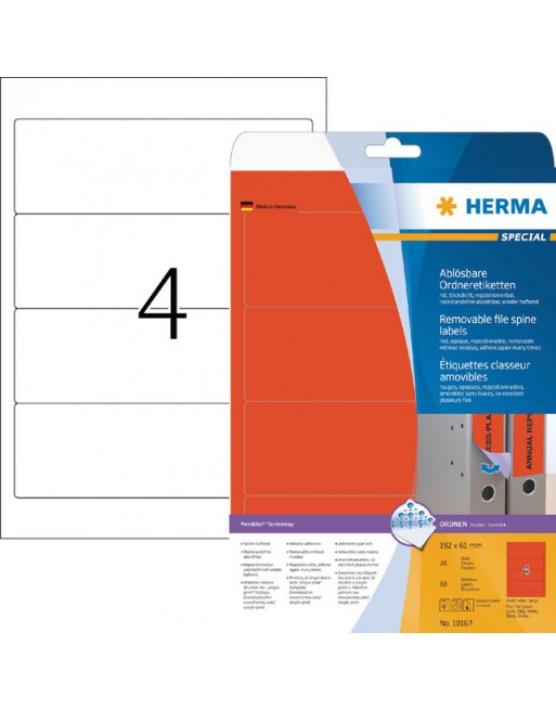 * Verwijderbare ordneretiketten op A4-vellen. * Met Movables®-Technology: goed hechtend, ook bij veelvuldig gebruik van de ordner, zonder achterblijvende resten weer te verwijderen. * Absoluut ondoorzichtig materiaal met een hoge witheidsgraad, oude ordneropschriften schijnen niet door. * Blanco, ideaal voor bedrijfslogo, opschriften en ordneraantekeningen. * Milieuvriendelijk: FSC Mix Credit-gecertificeerd, chloorvrij gebleekt, oplosmiddelvrije contactlijm. * Etiketten zijn 100% recyclebaar met het oud papier, verpakking van gerecycled karton. * Zeer goede afdrukresultaten op alle laser- en inkjetprinters, kopieerapparaten, kleurenlaserprinters en kleurenkopieerapparaten. * Storingvrije verwerking dankzij veiligheidsrand rondom en optimale vlakligging. * Gratis softwareoplossingen: www.herma.com/software. 1 doos x 20 vel