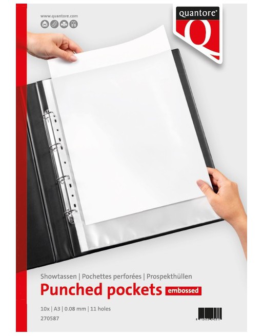 * Polypropyleen. * De bovenzijde is open voor het in-en uithalen van documenten. * Met 11 versterkte ponsgaten voor opberging in mappen, ringbanden en ordners. * A3-formaat.