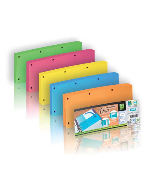 * Handige, gekleurde scheidingsstroken voor het snel verdelen en onderverdelen van documenten in ordners of ringbanden. * Met dubbele perforatie voor het horizontaal en verticaal organiseren van documenten. * In 5 frisse, moderne kleuren beschikbaar, kies voor ieder project of taak een andere kleur, dan zijn documenten efficiënt op te bergen én snel weer terug te vinden. * Beschrijf de scheidingsstroken, voor het creeëren van een eigen, gewenste indeling. * Afmetingen 240x105mm. * Van 100% recycled materiaal gemaakt. 1 pak x 60 stuk