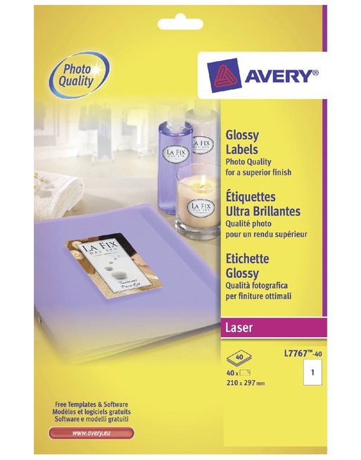 * Hoogglans kleurenlaseretiketten. * Welke behoefte u ook heeft, u wilt dat de etiketten er net zo stijlvol uitzien als de brochures. * Hoogglans-etiketten zijn gemaakt van een foto-kwaliteit materiaal, zodat de tekst en afbeeldingen echt zullen opvallen. * Dit vel met etiketten voor kleurenlaser printers is op A4-formaat. * Glanzende etiketten geven een meerwaarde aan uw mappen, documenten, catalogi, enz. * Bespaar tijd en geld door gebruik te maken van de gratis software en templates op de website van Avery via www.avery.eu 1 doos x 40 vel