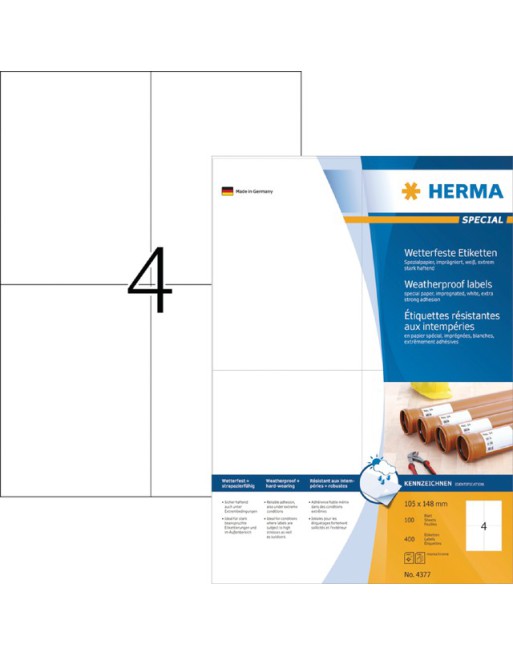 * Etiketten van weerbestendig speciaal geïmpregneerd papier. * Extreem sterk hechtend, ook op kritische oppervlakken. * Ideaal voor etiketten op zwaar belaste plaatsen en buiten. * Water, olie en vuil afstotend, verouderingsbestendig, zeewaterbestendig. * Temperatuurbestendig van -30 tot 80 °C. * Voor laserprinters en kopieermachines. * Niet geschikt voor inkjetprinters, kleurenlaserprinters en kleurenkopieerapparaten. * Gratis softwareoplossingen: www.herma.com/software. 1 doos x 100 vel