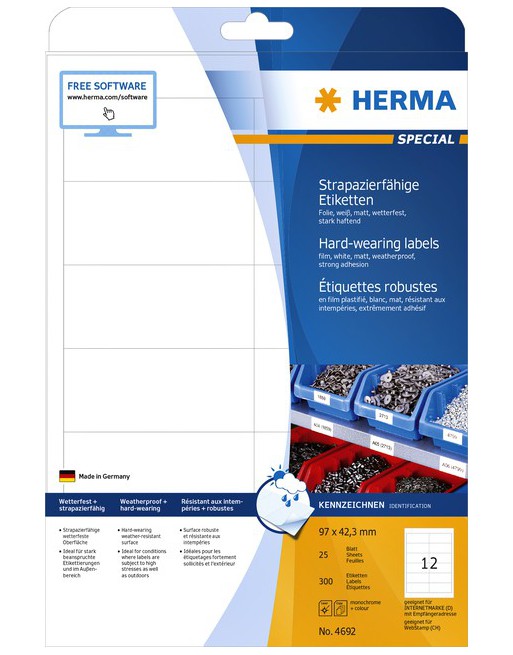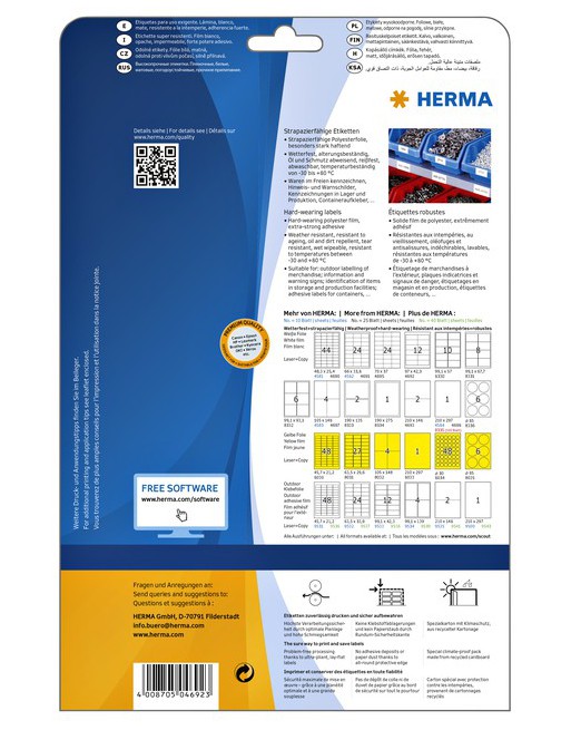 * Polyesterfolie-etiketten wit mat op A4-vellen, zelfklevend. Ideaal voor etiketteren op zwaar belaste plaatsen en geschikt voor buitengebruik: eigendomsetiketten, etalagestickers, attentie- en waarschuwingsplaatjes, labelen in het magazijn en in de productie. * Slijt- en weervast oppervlak, zeer sterk hechtend, verouderingsbestendig, olie en vuil afstotend, afwasbaar, temperatuurbestendig van -30 tot 80 °C, zeewaterbestendig. * Storingvrije verwerking dankzij veiligheidsrand rondom en optimale vlakligging. * Voor laserprinters en kopieerapparaten. * Niet geschikt voor inkjetprinters. Gratis softwareoplossingen: www.herma.nl/software.