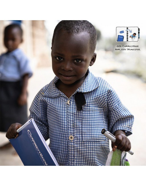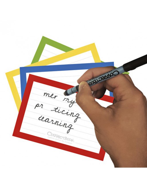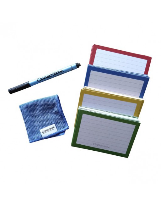 * Uitwisbare en herbruikbare flascards. * De Correctbook flashcards zijn vergelijkbaar met een whiteboard, maar dan in de vorm van kaartjes (0,5 mm dun). * De tekst droogt binnen enkele seconden en vlekt daarna niet meer. * De tekst is enkel uit te wissen met de achterkant van de Correctbook® fineliner, het Correctbook® Wisdoekje, de Correctbook® Sponsjes of de Correctbook® Schoonmaakset.* Het verhaal van Correctbook: 250 miljoen kinderen gaan iedere dag naar school zonder pen en papier. * Mede hierdoor zijn wereldwijd meer dan 750 miljoen mensen boven de 15 jaar analfabeet. * Daar komen wij tegen in actie. * Maak nu kennis met Correctbook; het uitwisbare notitieboek dat hier èn in ontwikkelingsgebieden oneindig mee gaat. * Met de opbrengt van één verkocht doosje Correctbook Flashcards, kan Correctbook één kind in Afrika één trimester lang van uitwisbaar schrijfmateriaal voorzien. * Dit krijg je bij jouw aankoop: 144 Uitwisbare Flashcards in de kleuren blauw, geel, groen en rood, in het forrmaat: 7.5cm x 11 cm, zwarte Correctbook fineliner en wisdoekje.
