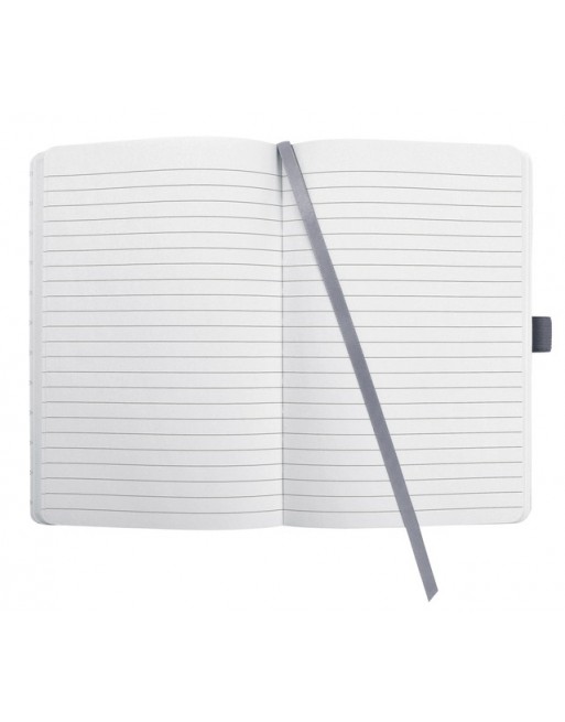 * Notitieboek met wit gelinieerd papier, 80grs (zuurvrij, houtvrij en elementair chloorvrij). * FSC gecertificeerd. * 174 pagina's waarvan 16 geperforeerd. * Het notitieboekje is voorzien van penlus, elastieksluiting, leeslint en opbergvak. * De cover is gemaakt van zacht kunststof met een 3D effect. * Formaat A6: 95x150x16mm. Kleur gletsjer grijs.
