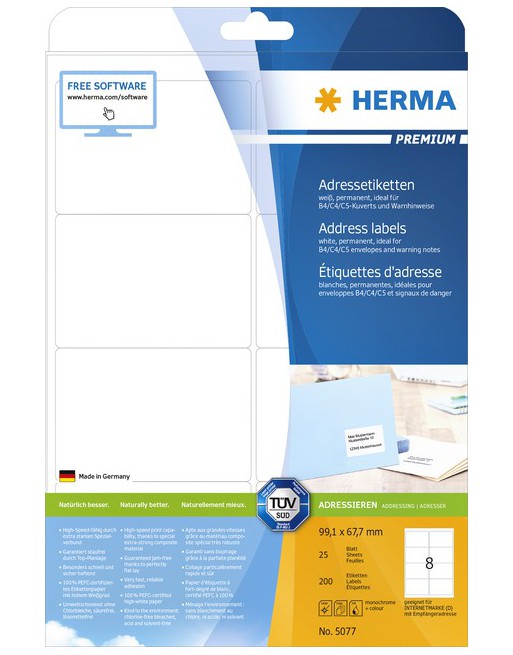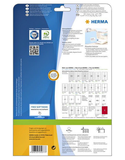 * Zelfklevende universele etiketten op A4-vellen, permanent hechtend. 25 vel per verpakking. * Perfect voor alle laser- en inkjetprinters, kopieerapparaten, kleurenlaserprinters en kleurenkopieerapparaten. * Gegarandeerd storingvrije loop en geschikt voor high-speed dankzij extra sterke speciale materiaalsamenstelling, top-vlakligging en een veiligheidsrand rondom. * Probleemloze doorvoer door de printer voor laserprinters en inkjetprinters getest en bevestigd door de TÜV SÜD. * Hoge witheidsgraad en gelijkmatig oppervlak voor de beste afdrukresultaten in zwart/wit en kleur. * Voelbaar dikker: extra dikke etiketten - eenvoudig opplakken. * Zeer snel en goed hechtend, ook op koude en vochtige oppervlakken. * Milieuvriendelijk en duurzaam: chloorvrij gebleekt, PEFC-gecertificeerd, oplosmiddelvrije contactlijm. * Etiketten zijn 100 % recyclebaar via het oud papier, verpakking van gerecycled karton. * Gratis softwareoplossingen: www.herma.com/software.