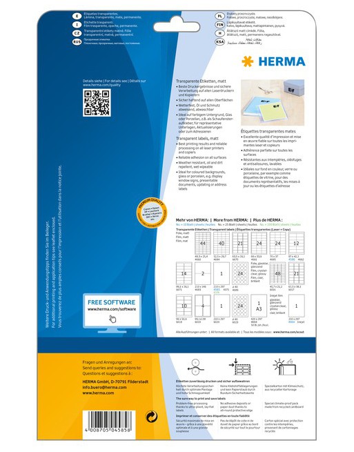 * Transparante matte folie-etiketten op A4-vellen, zelfklevend. * Perfect voor optisch hoogwaardige toepassingen, ideaal op een gekleurde ondergrond, glas, porselein, voor representatieve documenten, updates of om te adresseren. * No-label-effect: opschrift lijkt direct opgedrukt. * Weervast, verouderingsbestendig, olie en vuil afstotend, afwasbaar. * Storingvrije verwerking dankzij veiligheidsrand rondom en optimale vlakligging. * Voor laserprinters en kopieerapparaten, kleurenlaserprinters en kleurenkopieerapparaten. * Niet geschikt voor inkjetprinters. * Gratis softwareoplossingen: www.herma.com/software.
