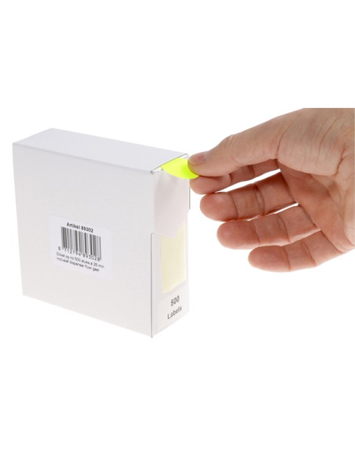 * Fluor gele ronde etiketten in kartonnen dispenser. * 500 etiketten per rol. * Doorsnede 25 mm