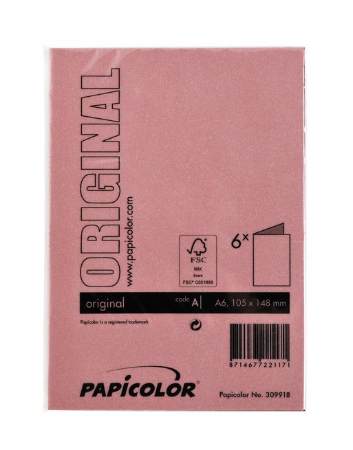 * Gekleurde dubbele kaarten A6. * In verschillende kleuren beschikbaar. * Afmeting 105x148mm, gevouwen. * 210 grams papier. * Pak a 6 stuks. * Geschikt voor hobby doeleinden. * In dezelfde kleuren zijn ook enveloppen en A4 papier beschikbaar.