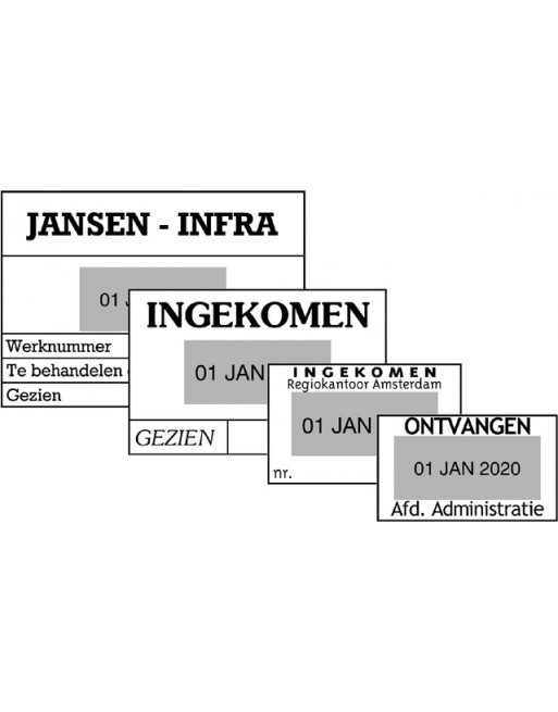 * Als u een eigen tekst wil combineren met een datum, dan is dit de ideale stempel. * In het midden van de stempel kunt u de datum instellen. * Boven en/of onder deze datum kunt u uw eigen tekstplaatje plakken. * Afdrukformaat 49x68mm. * Er is ruimte voor 9 regels tekst (incl. datum). * Inclusief een waardebon om uw tekst aan te vragen. * Met zwart verwisselbaar inktkussen. * De letterhoogte van de datum is 4mm.* Deze stempel gaat tot het jaar 2029. 1 stuk