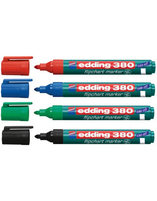 * edding Flipchart Marker met ronde punt. * Drukt niet door. * Cap-off techniek: droogt zonder dop enkele dagen niet uit. * Kunststof houder, cap met pocketclip. * Sneldrogende, geurneutrale inkt. * Cap-off inkt kan tijdelijk open worden bewaard zonder uit te drogen. * Economisch: navulbaar. * Schrijfbreedte 1,5-3mm. 1 set x 4 stuk
