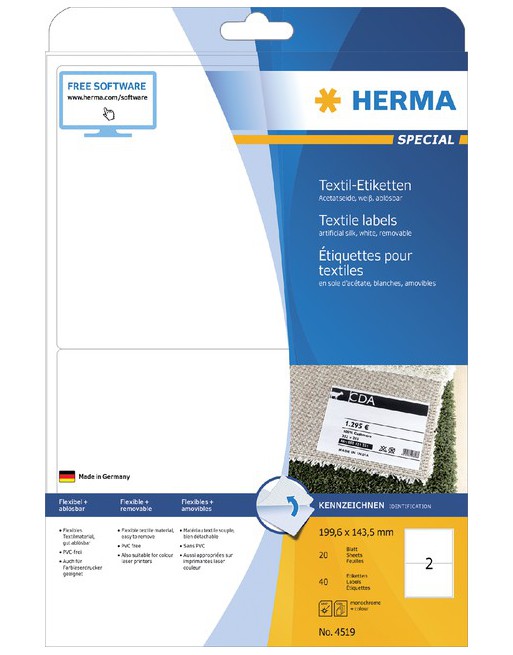 * Etiketten van acetaatzijde, op A4-vellen, zelfklevend. * Ideaal geschikt voor seminars, vergaderingen, beurzen of voor het labelen van stoffen, tapijten en matrassen. * Praktisch alternatief voor plastic plaatjes: snel beschreven, perfect hechtend zonder speldje. * Flexibel textielmateriaal, goed hechtend, goed verwijderbaar. * Attentie: niet op fijn leer of fijne textiel, bijv. zijde of fluweel plakken. * Voor laserprinters, kopieerapparaten, kleurenlaserprinters en kleurenkopieerapparaten. * Niet geschikt voor inkjetprinters. * Gratis softwareoplossingen: www.herma.com/software.
