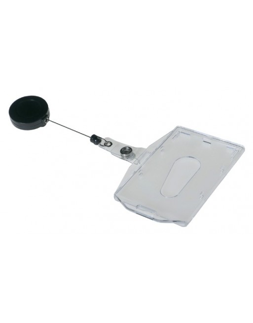* Hard kunststof transparante veligheidspashouder. * Gesloten uitvoering. * Zijkant open. * Inclusief een afrolmechanisme met stevige metalen klem. * Lengte koord 80cm. * Door de strip met drukknopsluiting blijft de badge altijd recht hangen. * Geschikt voor formaat 54x85mm. * Verpakt per 10 stuks. 10 stuk