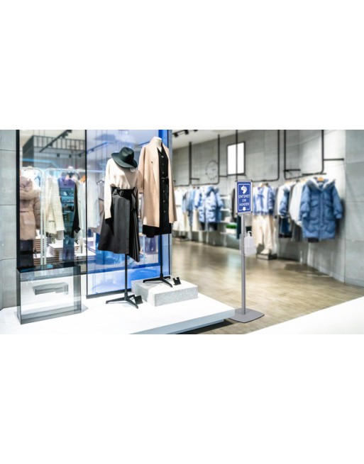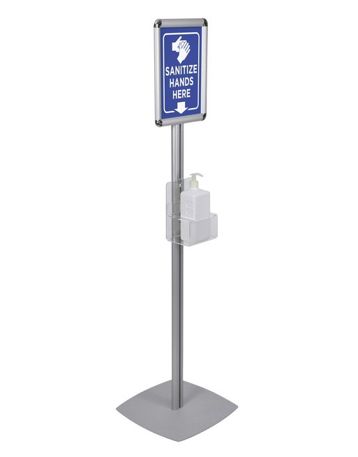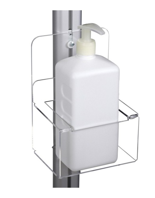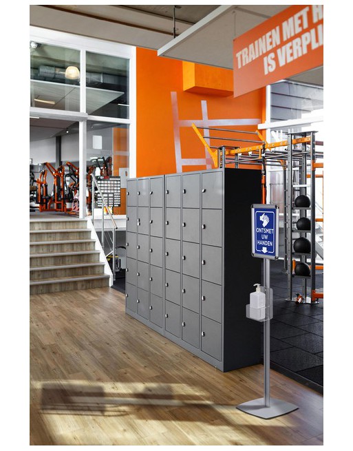 * Vrijstaande handhygiëne infostand voorzien van houder voor een gel -of zeep pompfles. * De A4 kliklijst is een ideaal communicatiemiddel om bijvoorbeeld geldende maatregelen te tonen. * Door middel van de stabiele en zware basis geschikt voor drukke openbare gelegenheden. * De houder is ontworpen voor alle universele flessen reinigingsmiddel van 500ML. * Een pompfles reinigingsmiddel is niet bijgesloten.