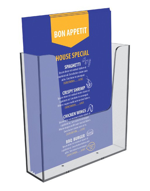 * Folderbakje voor een glasheldere presentatie aan de wand van folders, catalogi en prijskaarten. * Stevig en glashelder hoogwaardig 3mm dik kunststof. * Voorzien van boorgaten. * Capaciteit 35 mm. * In verschillende formaten verkrijgbaar. 1 stuk