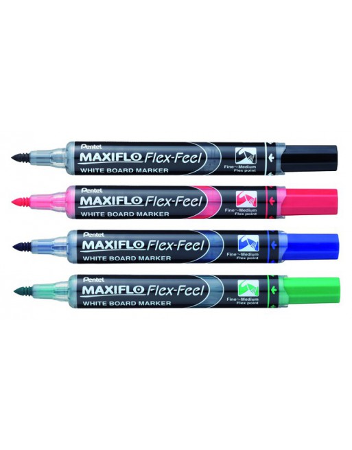 * Innovatie van Pentel op het gebied van whiteboardmarkers! * Whiteboardmarker met flexibele punt voor wisselende lijndiktes. * De flexibele punt ondersteunt de schrijfbeweging waardoor het handschrift er sierlijk uitziet. * Een compleet nieuw schrijfgevoel op whiteboards. * Uniek pompsysteem zorgt ervoor dat de marker niet kan uitdrogen. * De vloeibare inkt maakt de tekst goed zichtbaar. * Gaat 2 á 3 maal langer meer. * Droog uitwisbaar. * Lijndikte 1-5mm.