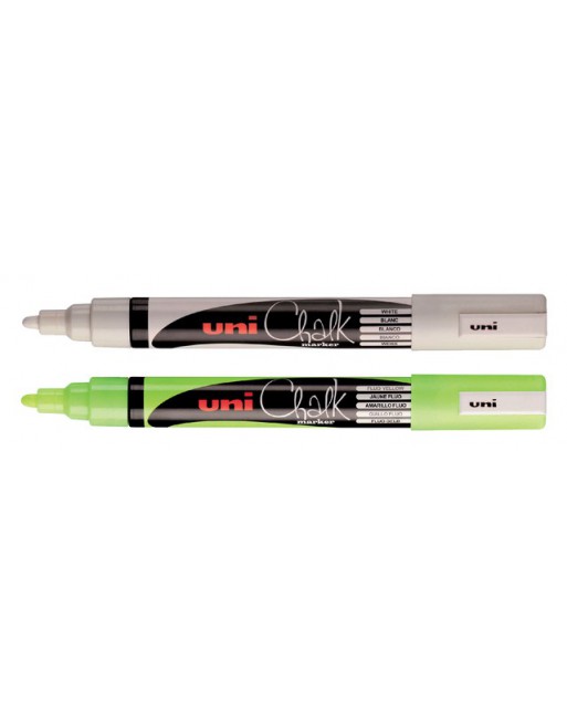 * Uni-ball Chalkmarker. * Geschikt voor gebruik op glas, metaal en niet-poreuze oppervlakken. * Waterbestendig, verregend niet. * Kan met een natte doek door wrijving makkelijk en schoon verwijderd worden. * Ideaal voor dagelijks gebruik. * Schrijfbreedte 1.8-2.5mm.