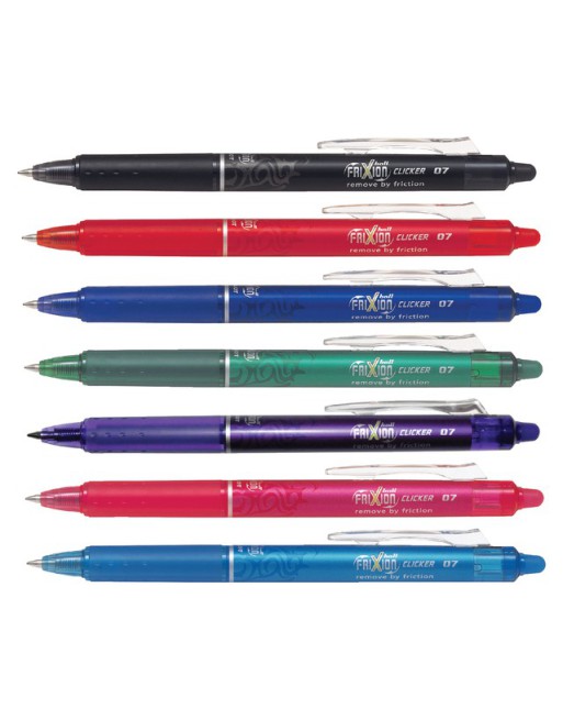 De uitgumbare Frixion retractable, nu met een clip die de penpunt met een "klikindicator"in- en uitschuift. * Write-delete-repeat rollerpen in één. * Zonder gum, zonder wisser, zonder papierbeschadigingen. * De speciale inkt reageert op warmte, door wrijving met het rubber uiteinde van de pen verdwijnt de inkt en is meteen overschrijfbaar. * Hoogstaande technologie. * Navulbaar met vulling 2261. * Schrijfbreedte 0,35mm - kogelbreedte 0,7mm. 1 stuk