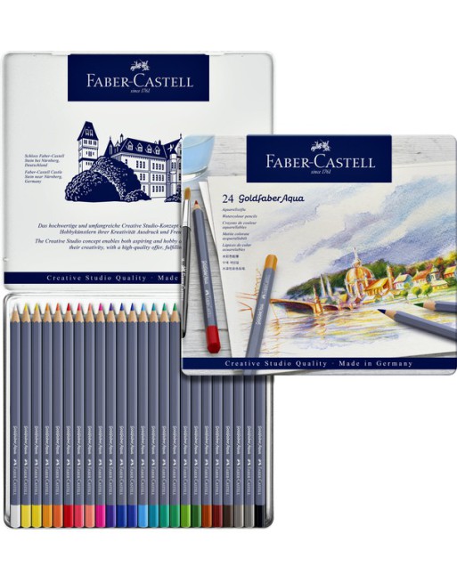 * Kleurpotlood aquarel, 3,3mm breukvaste kern, in hout gevat, hexagonale uitvoering. * Volledig met water oplosbaar. * Hoogwaardige pigmenten met voortreffelijke kleurkracht en lichtbestendigheid. * Houder gelakt in blauwe kleur en achterzijde gelakt in de kleur van het potlood. * De Goldfaber aqua kleurpotloden bevatten een samenstelling van was met pigmenten, hulp- en vulstoffen, oppervlakte-actieve stoffen en bevatten geen olie. 1 blik à 24 stuks