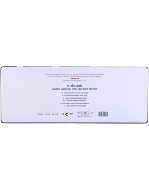 * Kleur er fijn op los met deze 45 kwaliteitskleurpotloden van Bruynzeel. * De potloden zijn gemaakt van hoogwaardige pigmenten, waardoor ze een mooie kleurafgifte hebben en onderling goed mengbaar zijn. * De dikke kern van 2,9 mm zorgt voor extra lang kleurplezier. *De potloden worden in een stevig blik geleverd zodat je na het kleuren je potloden weer netjes kunt opruimen. * Het handige bewaarblik met opdruk van een schildpad bevat 45 kleurpotloden. * Gebruik een kleurenpuntenslijper voor de optimale levensduur van de kleurpotloden. *Alle potloden van Bruynzeel zijn glutenvrij en met zorg vervaardigd uit verantwoord verkregen hout. * Ook zijn Bruynzeel potloden dubbel gelijmd, zodat ze extra sterk zijn en de kans dat de kleurkern breekt – bijvoorbeeld als het potlood op de grond valt – minimaal is! Dit voorkomt gebroken punten en zorgt ervoor dat je het potlood amper hoeft te slijpen. * Bruynzeel, voor langdurig kleurplezier! 1 blik à 45 stuks