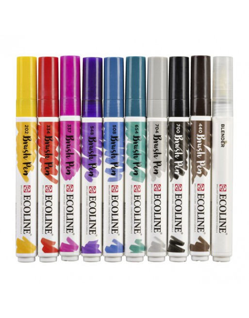 * Ecoline Brush Pen set met 10 kleuren die typisch voor handlettering gebruikt worden; de superhandige brush pens zijn direct klaar voor gebruik en ook nog eens geurloos. * Je gebruikt de Brush Pen voor dunne precieze lijnen of voor energieke streken, maar ook voor het vullen van grote kleurvlakken. * De Ecoline Brush Pens hechten uitstekend op aquarelpapier, tekenpapier en karton. * Ze zijn ook ideaal voor onderweg of als je op een plek werkt die schoon moet blijven. * Kleuren: Donkergeel (202), Scharlaken (334), Magenta (337), Sepia Donker (440), Pruisisch Blauw (508), Blauwviolet (548), Dennengroen (654), Zwart (700), Grijs (704), Blender (902).
