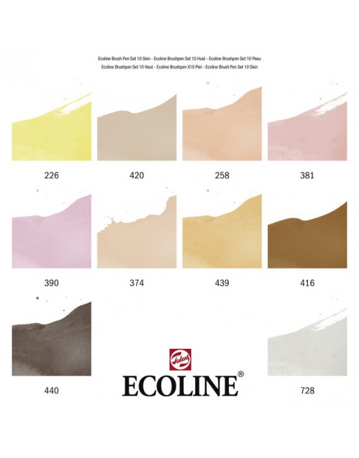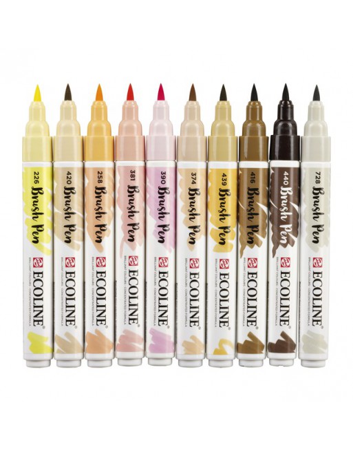* Ecoline Brush Pen set met 10 kleuren die typisch voor portretten gebruikt worden; de superhandige brush pens zijn direct klaar voor gebruik en ook nog eens geurloos. * Je gebruikt de Brush Pen voor dunne precieze lijnen of voor energieke streken, maar ook voor het vullen van grote kleurvlakken. * De Ecoline Brush Pens hechten uitstekend op aquarelpapier, tekenpapier en karton. * Ze zijn ook ideaal voor onderweg of als je op een plek werkt die schoon moet blijven. * Kleuren: Pastelgeel (226), Abrikoos (258), Roze Beige (374), Pastelrood (381), Pastelroze (390), Sepia (416), Beige (420), Sepia Licht (439), Sepia Donker (440), Warmgrijs Licht (728).