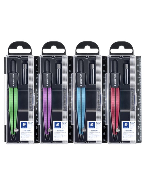* Noris 550 schoolpasser zit in een etui met klapdeksel. * Precisiepasser voor de eerste tekenoefeningen op school. * Met stompe veiligheidsnaald. * Max. cirkel diameter ca. 300mm. * Lengte 124mm. * Set bevat passer 550 50 met reserve potloodstukje.