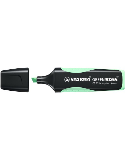 * De STABILO GREEN BOSS Pastel is een tekstmarkeerstift gemaakt van 83 % gerecycled kunststof voor scholieren, studenten, leerkrachten en kantoormedewerkers met aandacht voor het milieu. * De tekstmarkeerstift is er nu ook in 4 pastelkleuren! * De GREEN BOSS kenmerkt zich door de unieke STABILO Anti-Dry-Out Technology en kan daardoor tot wel 4 uur zonder dop zonder uit te drogen. * Ideaal bij langdurig markeren van teksten en geconcentreerd doorwerken. * De GREEN BOSS markeert en ondertreept met 2 schrijfbreedtes: 2 en 5 mm. * Dankzij de antislip gripzone ligt de stift stevig in de hand.