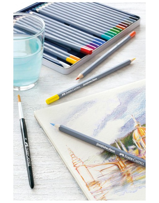 * Aquarelpotlood, 3,3 mm breukvaste kern, in hout gevat, hexagonale uitvoering. * Volledig met water oplosbaar. * Hoogwaardige pigmenten met voortreffelijke kleurkracht en lichtbestendigheid. * Houder gelakt in grijze kleur en achterzijde gelakt in de kleur van het potlood. * De Goldfaber aqua kleurpotloden bevatten een samenstelling van was met pigmenten, hulp- en vulstoffen, oppervlakte-actieve stoffen en bevatten geen olie.