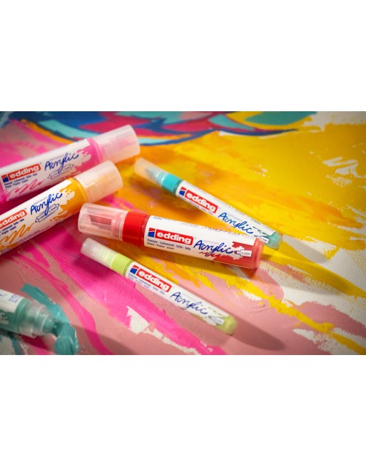 * Acrylmarker om te verven op lichte of donkere oppervlakken, ideaal voor materialen zoals linnen of verfpapier. * De ronde punt heeft een schrijfdikte van 2-3 mm.* De hoogwaardige gepigmenteerde acrylverf op waterbasis dekt goed, is lichtecht, geurloos en permanent wanneer de verf droog is. Verkrijgbaar in 26 verschillende kleuren. * Er zijn verschillende schrijfbreedtes beschikbaar. * Geschikte reservepunten (edding 5100 reservepunten) verkrijgbaar.