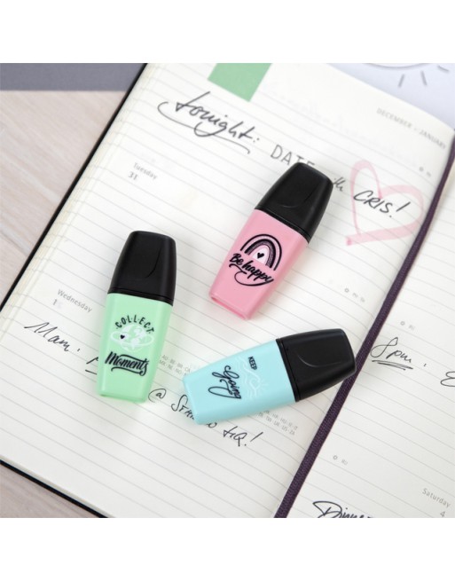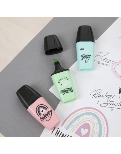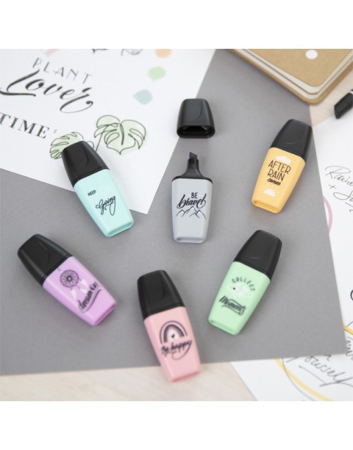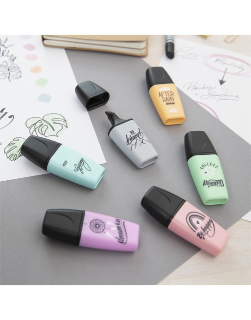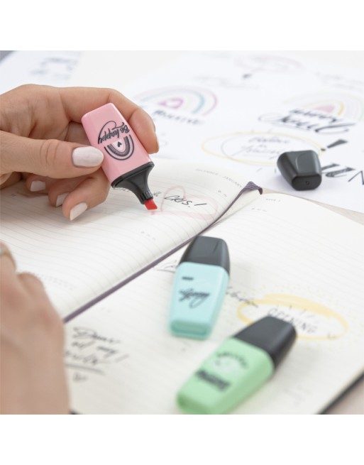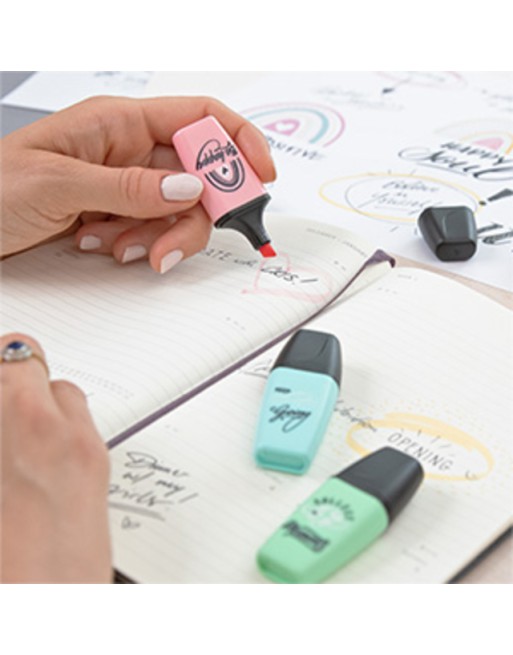 * De STABILO BOSS MINI Pastellove is de nieuwe uitvoering van de bekende BOSS MINI markeerstiften. * Maak van iedere tekst een echte eye-catcher! * De bekende kwaliteit van de grote STABILO BOSS in een handig mini formaat. * Onderstrepen én markeren dankzij de beitelpunt met twee schrijfbreedtes: 2 en 5 mm. * Maak je geen zorgen als je de dop er even af laat, de markeerstiften kunnen tot 4 uur zonder dop zonder uit te drogen, dankzij de anti-uitdroog technologie. * Passen makkelijk in je etui en zijn perfect voor onderweg. *Inkt op waterbasis. * De pastel kleuren maken het markeren en onderstrepen van teksten extra leuk. * Met verschillende opdruk met als thema ´stay positive´ – de kunst om optimistisch te blijven in uitdagende tijden.