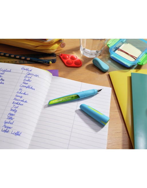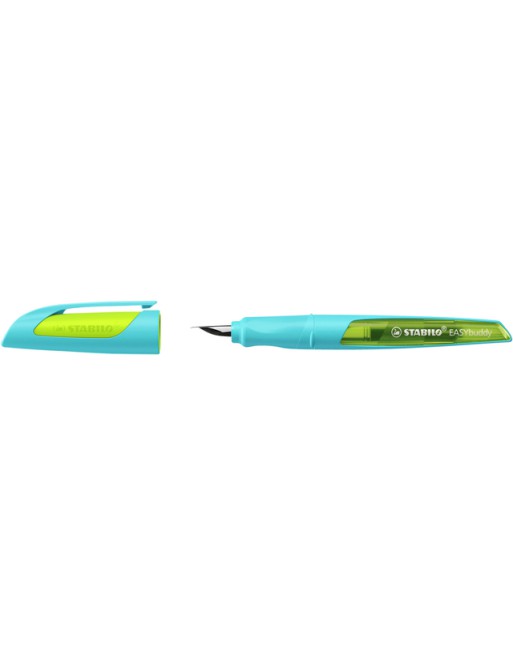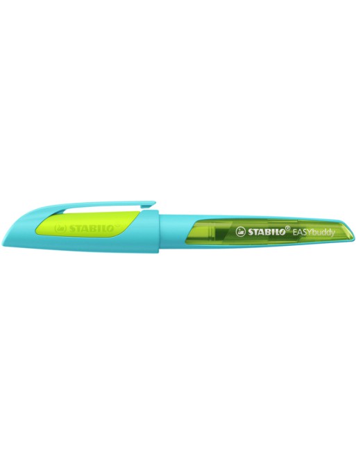 * Leren schrijven is een uitdaging! * De ergonomische STABILO EASYbuddy vulpen helpt kinderen vanaf 8 jaar bij de ontwikkeling van een goed handschrift. * De EASYbuddy is een ijzersterke vulpen van zeer hoge kwaliteit en staat garant voor schrijven met plezier! *Ergonomische vulpen voor kinderen vanaf 8 jaar. *Drupt niet, krast niet. *Sterke punt met iridium schrijfpunt. *Dop met veermechanisme, de pen kan niet gaan lekken door pompeffect. *Inclusief één vulling – blauw schrijvend. *Extra groot venster voor zicht op inktniveau. *Navulbaar met standaard vulpen vullingen. * De STABILO EASYbuddy is een ergonomische vulpen. * Met de specifieke behoeftes van kinderen, ouders en leerkrachten in gedachten, zijn we er in geslaagd een vulpen te ontwikkelen waarmee leren schrijven een easy taak wordt! *Alle STABILO EASYstart producten zijn ontwikkeld in samenwerking met ouders, leerkrachten, kinderen én experts op het gebied van ergonomie. * De producten zijn ergonomisch vormgegeven en sluiten qua gewicht, formaat en vorm perfect aan op de anatomie van de kinderhand. * Daardoor liggen de pennen en potloden goed in de hand en houden kinderen ze intuïtief op de juiste manier vast. * Zo kunnen ze op een ontspannen manier (leren) schrijven en zijn vermoeide spieren en krampklachten verleden tijd. * Kinderen kunnen zich volledig concentreren op het oefenen en schrijven van de letters en hoeven zich niet meer druk te maken over het vasthouden van hun pen of potlood.