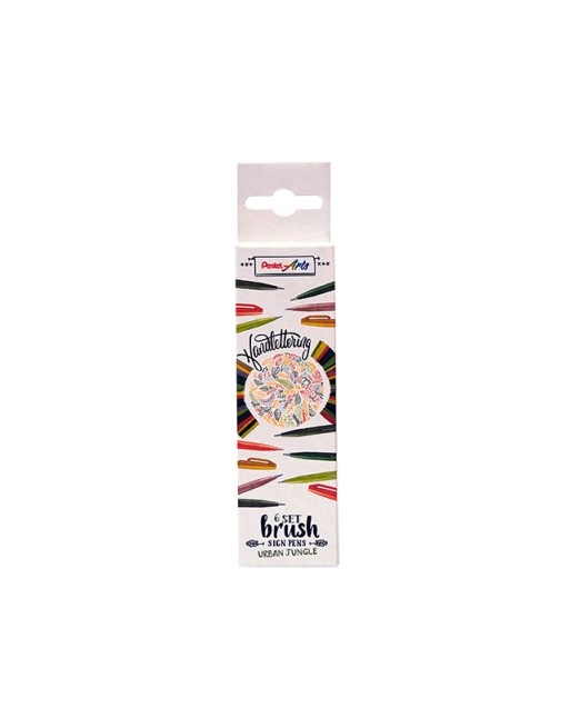 * Pentel Brush Sign set Urban Jungle. * Deze set bevat 6 kleuren. * Dankzij de flexibele vezelpunt van de Pentel Brush Sign Pen zijn variabele lijndiktes mogelijk, afhankelijk van de druk. * Met zijn fijne flexibele punt is het de ideale pen voor schetsen, illustreren, handlettering en kalligrafie op kleine schaal. * Gemakkelijk te hanteren en daarom bijzonder geschikt voor beginners. * Inkt op waterbasis. * In metaal gevatte zeer robuuste punt. * Niet navulbaar.