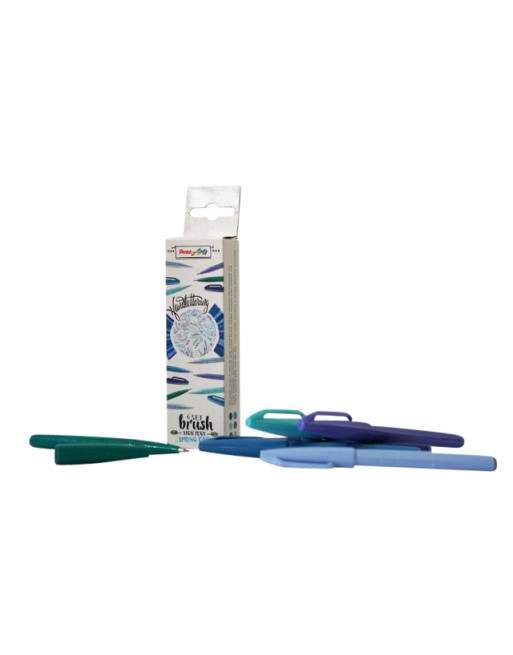 * Pentel Brush Sign set Spring Rain. * Deze set bevat 6 kleuren. * Dankzij de flexibele vezelpunt van de Pentel Brush Sign Pen zijn variabele lijndiktes mogelijk, afhankelijk van de druk. * Met zijn fijne flexibele punt is het de ideale pen voor schetsen, illustreren, handlettering en kalligrafie op kleine schaal. * Gemakkelijk te hanteren en daarom bijzonder geschikt voor beginners. * Inkt op waterbasis. * In metaal gevatte zeer robuuste punt. * Niet navulbaar.