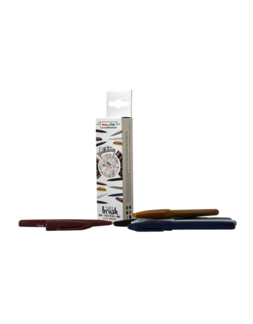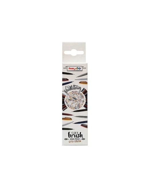 * Pentel Brush Sign set City Crush. * Deze set bevat 6 kleuren. * Dankzij de flexibele vezelpunt van de Pentel Brush Sign Pen zijn variabele lijndiktes mogelijk, afhankelijk van de druk. * Met zijn fijne flexibele punt is het de ideale pen voor schetsen, illustreren, handlettering en kalligrafie op kleine schaal. * Gemakkelijk te hanteren en daarom bijzonder geschikt voor beginners. * Inkt op waterbasis. * In metaal gevatte zeer robuuste punt. * Niet navulbaar.