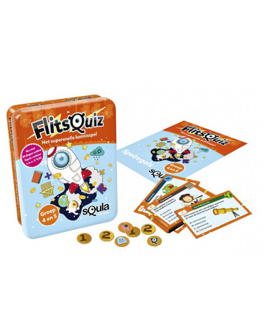 * Flitsquiz voor groep 4 en 5! * Test je kennis in dit flitsende kaartspel! * Geef jij als snelste het juiste antwoord? * Het spel bestaat uit meer dan 100 uitdagende vragen over verschillende basisschoolvakken. * Draai een kaart open op tafel en bedenk het goede antwoord. * Weet jij het juiste antwoord? * Wees dan snel, voor je het weet is iemand je voor! * Degene met de meeste punten wint. * Speel snel en slim. * Klaar voor de start?... Flits! Veel speelplezier!