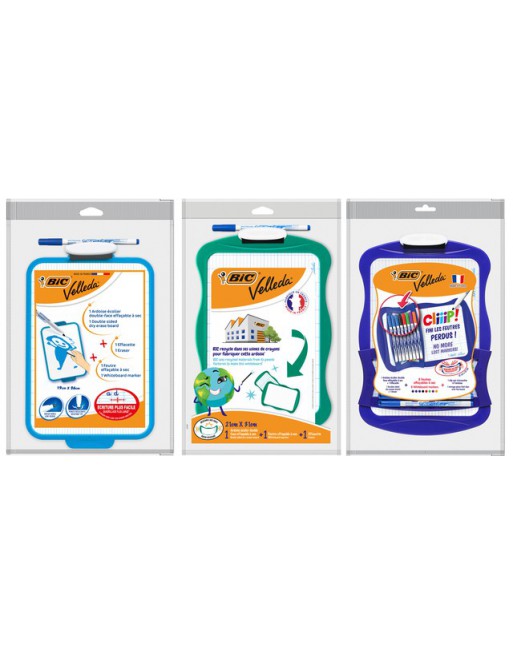 * Dit BIC Velleda droog uitwisbare whiteboard is gemaakt van gerecycleerde BIC pennen! * Deze complete set omvat een dubbelzijdig whiteboard, 1 uitwisbare whiteboard stift met BIC Velleda 1721 marker met dunne punt met blauwe inkt en een wisser die aan het bord bevestigd kan worden. * De handige clip op het whiteboard zorgt ervoor dat u markers makkelijk kunt opbergen na gebruik. * Dit whiteboard voor kinderen heeft een onbedrukte kant voor tekeningen en rekensommen, en een raster aan de andere kant voor leren schrijven. * Dankzij de magnetische wisser, is het whiteboard makkelijk schoon te vegen, zelfs na een paar dagen. * Dit lichte en zeer stevige 21 x 31 cm whiteboard is ook praktisch voor kleine handen dankzij de speciaal ontworpen vorm. * Gemaakt in Frankrijk.