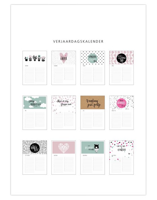 * Vergeet jij tot je grote schrik ook nog wel eens een verjaardag? * Dan zijn deze kalenders echt iets voor jou. * De kalenders zittenop een leuk en handig houten mdf klembord. * De klem op het klembord bevat een oogje waardoor je de kalender eenvoudig kunt ophangen. * Het klembord en de kalender zijn beide op A4 formaat, behalve een kalender zitten er ook 3 hele leuke wenskaarten bij. Heel handig: je kunt dus meteen een kaartje versturen! * Elke kalender bestaat uit 14 pagina's: voorblad, 12 maanden en achterblad met overzicht van de maanden * Afmeting kalender: 210x297 mm * De kalenders zijn ongedateerd.