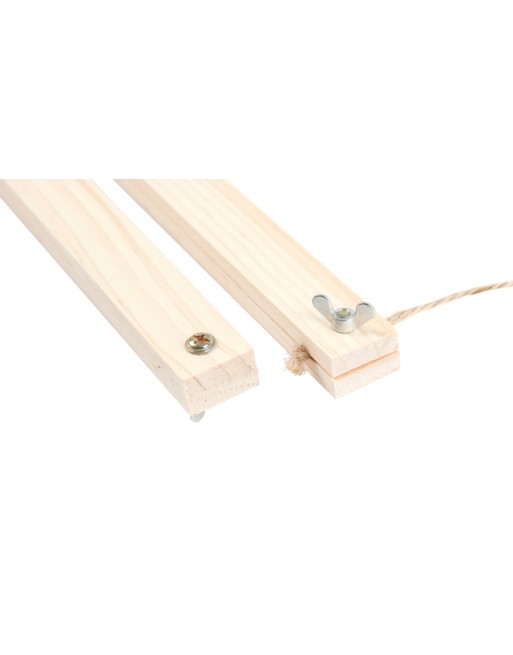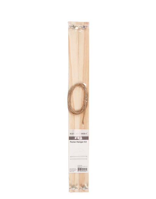 * Set van posterlijsten van licht hout. * De set bestaat uit 2 boven- en 2 onderlijsten, waarbij de ophanging wordt gefixeerd door middel van een vleugelmoer. * Geleverd met apart ophangkoord, dat met een knoop aan de nderzijde van de bovenstre strips is bevestigd. * Afmeting: diepte 2,2cm, breedte 33,6cm, hoogte 2cm.