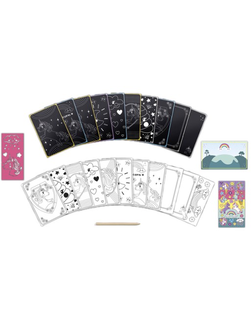* Unicorn krasboek met ringband. * Maak 10 luxe metallic kraskaarten inclusief 11 kleurplaten, stickers, achtergrond en kraspen.