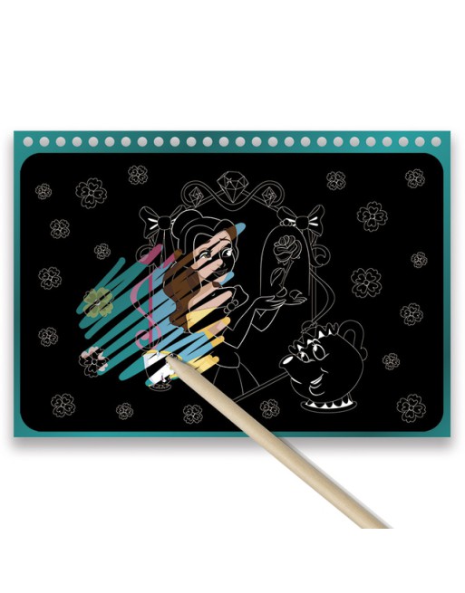* Disney Princess krasboek met ringband. * Maak 10 luxe glinsterende kraskaarten inclusief 11 kleurplaten, stickers, achtergrond en kraspen.